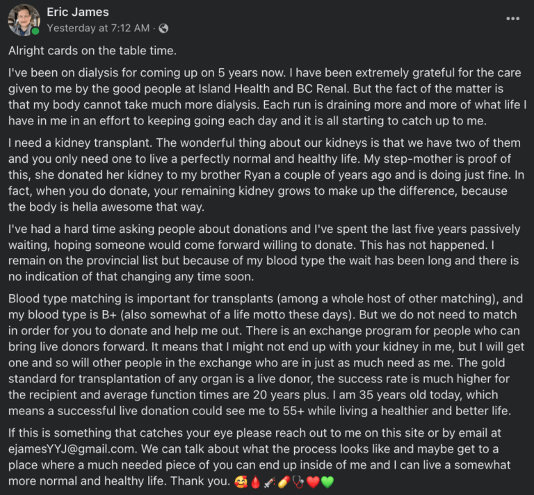 This is in part why he made a post on Facebook reaching out and telling a bit of his story in order to find a kidney donor and live his life a bit more normally for at least 20 years.